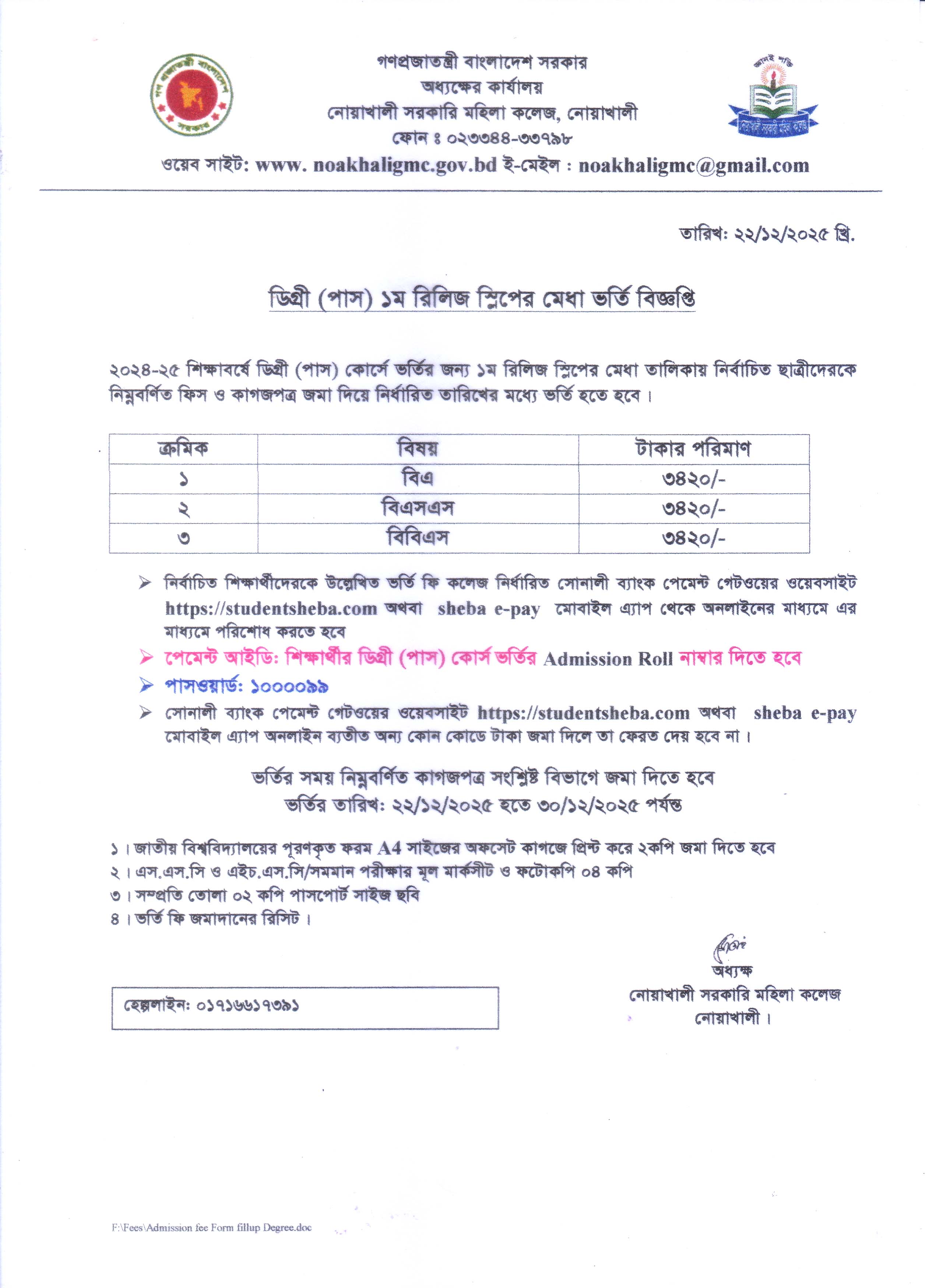 ডিগ্রি (পাস) ১ম বর্ষ (২০২৪-২৫ শিক্ষাবর্ষ) ১ম রিলিজ স্লিপের মাধ্যমে ভর্তির বিজ্ঞপ্তি