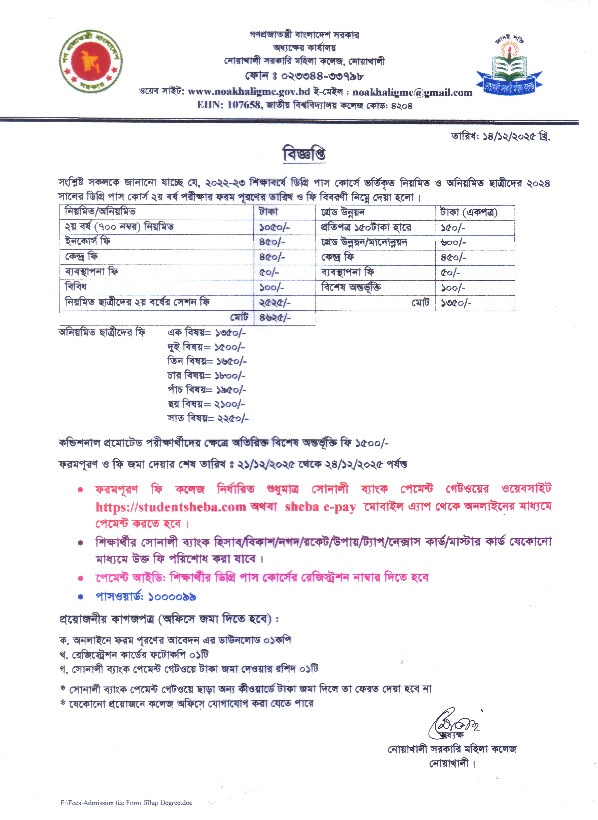 নোয়াখালী সরকারি মহিলা কলেজে ২০১৯-২০ শিক্ষাবর্ষ (বর্তমানে দ্বাদশ শ্রেণি) ছাত্রীদের দ্বাদশ শ্রেণির সেশন ফি প্রদান সংক্রান্ত বিজ্ঞপ্তি