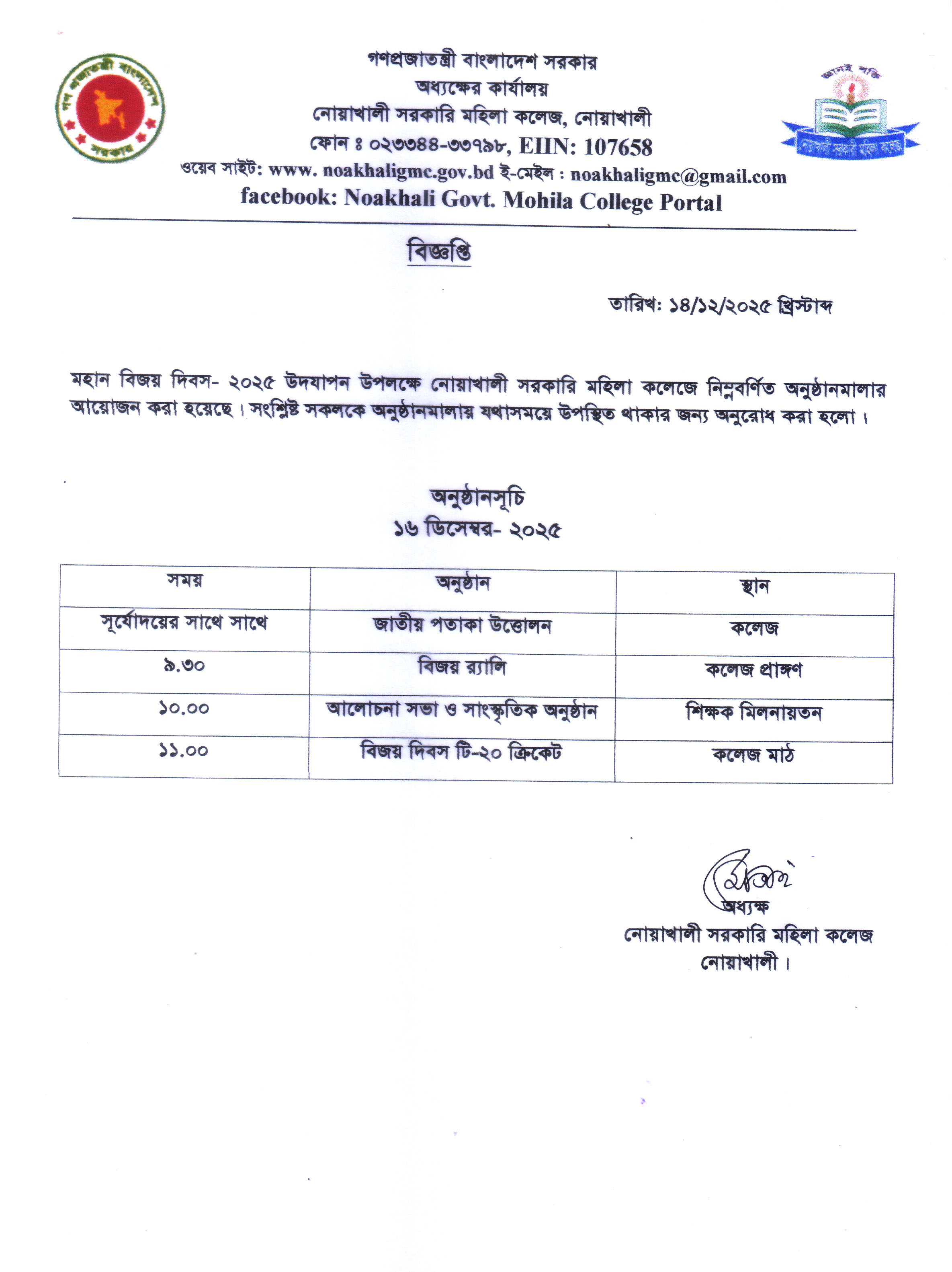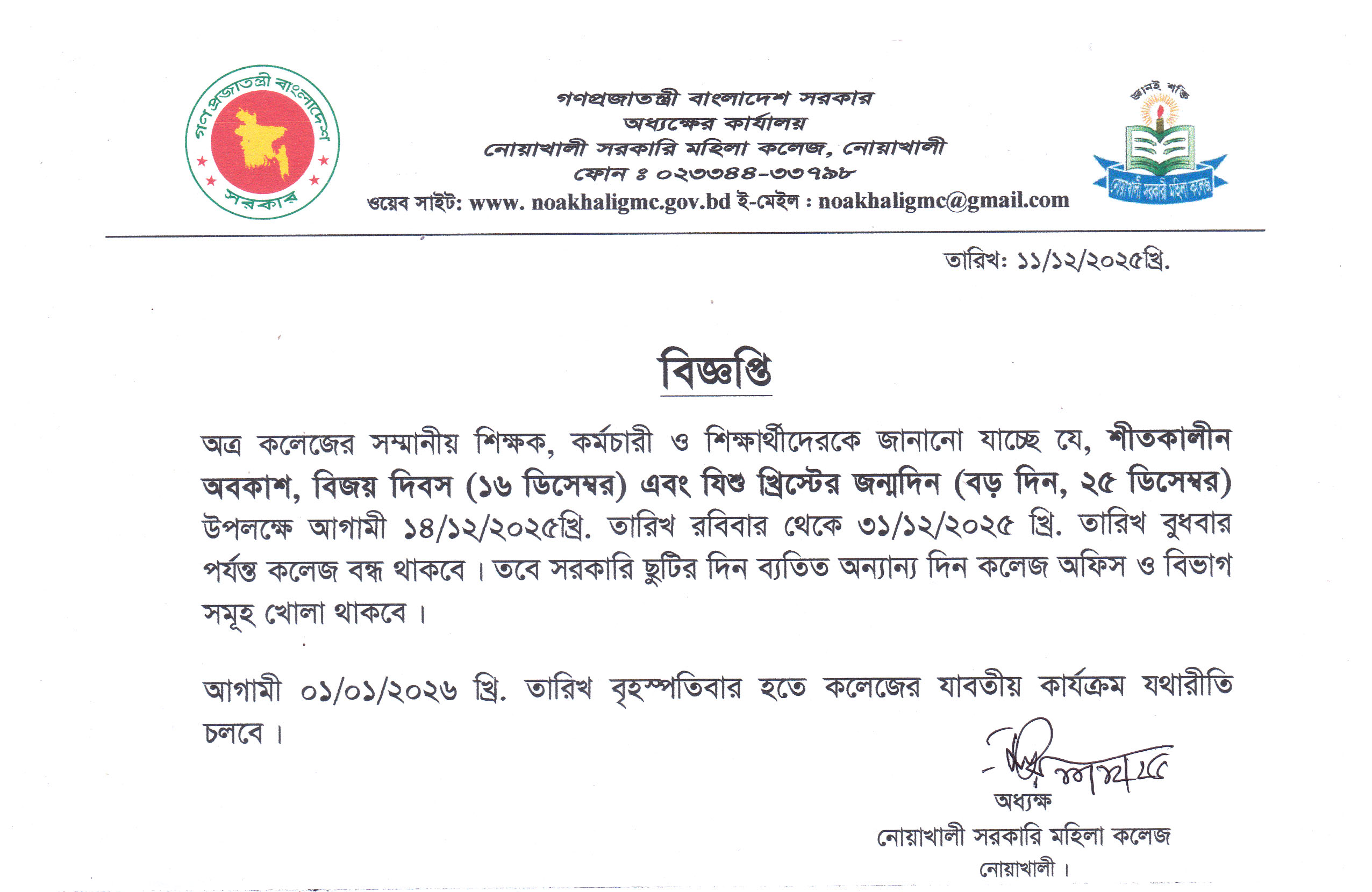 শীতকালীন অবকাশ, বিজয় দিবস ও যিশু খ্রিস্টের জন্মদিন উপলক্ষে কলেজ বন্ধ সংক্রান্ত বিজ্ঞপ্তি