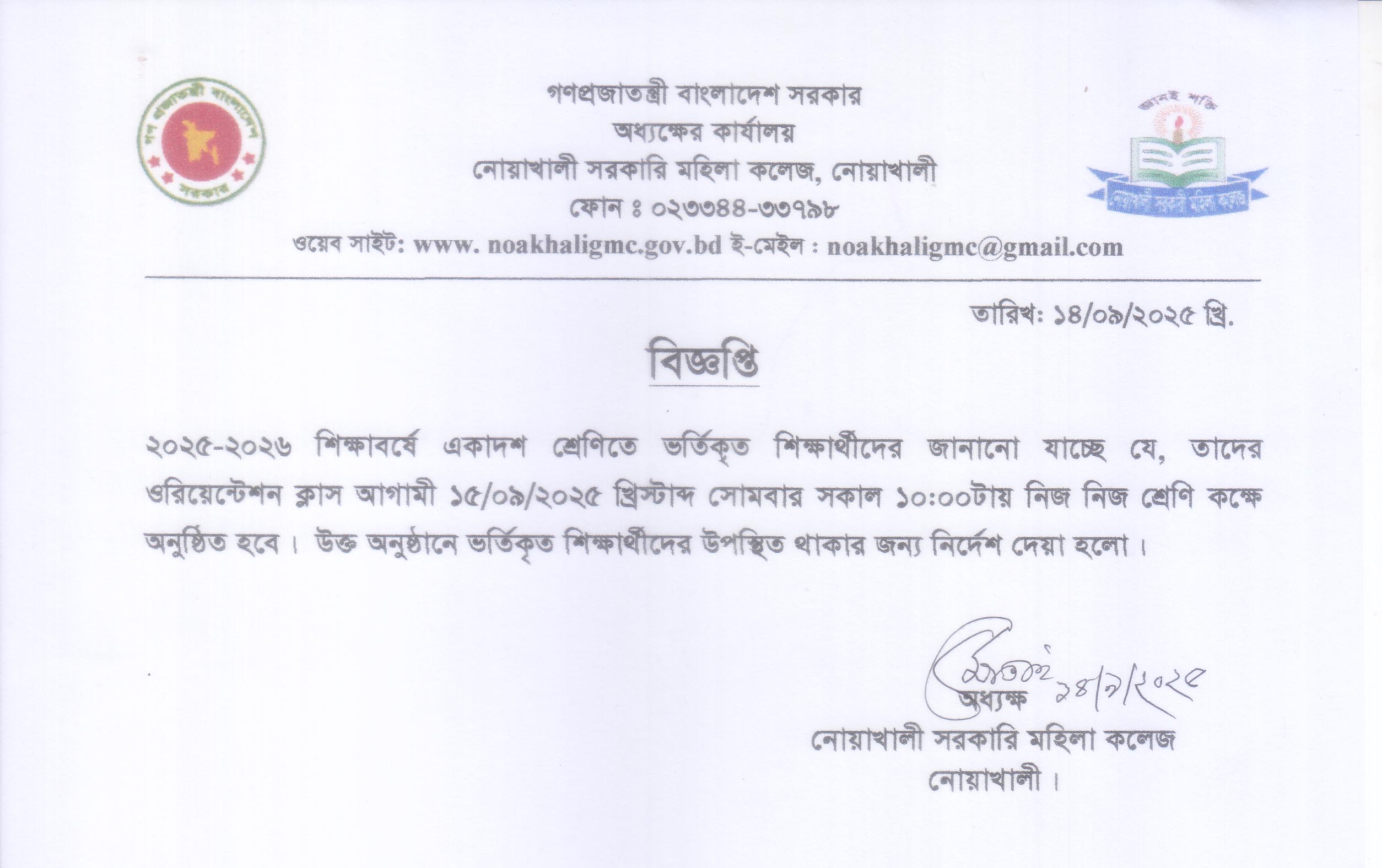 ২০২৫-২০২৬ শিক্ষাবর্ষে একাদশ শ্রেণির ভর্তিকৃত শিক্ষার্থীদের ওরিয়েন্টেশন ক্লাস এর বিজ্ঞপ্তি