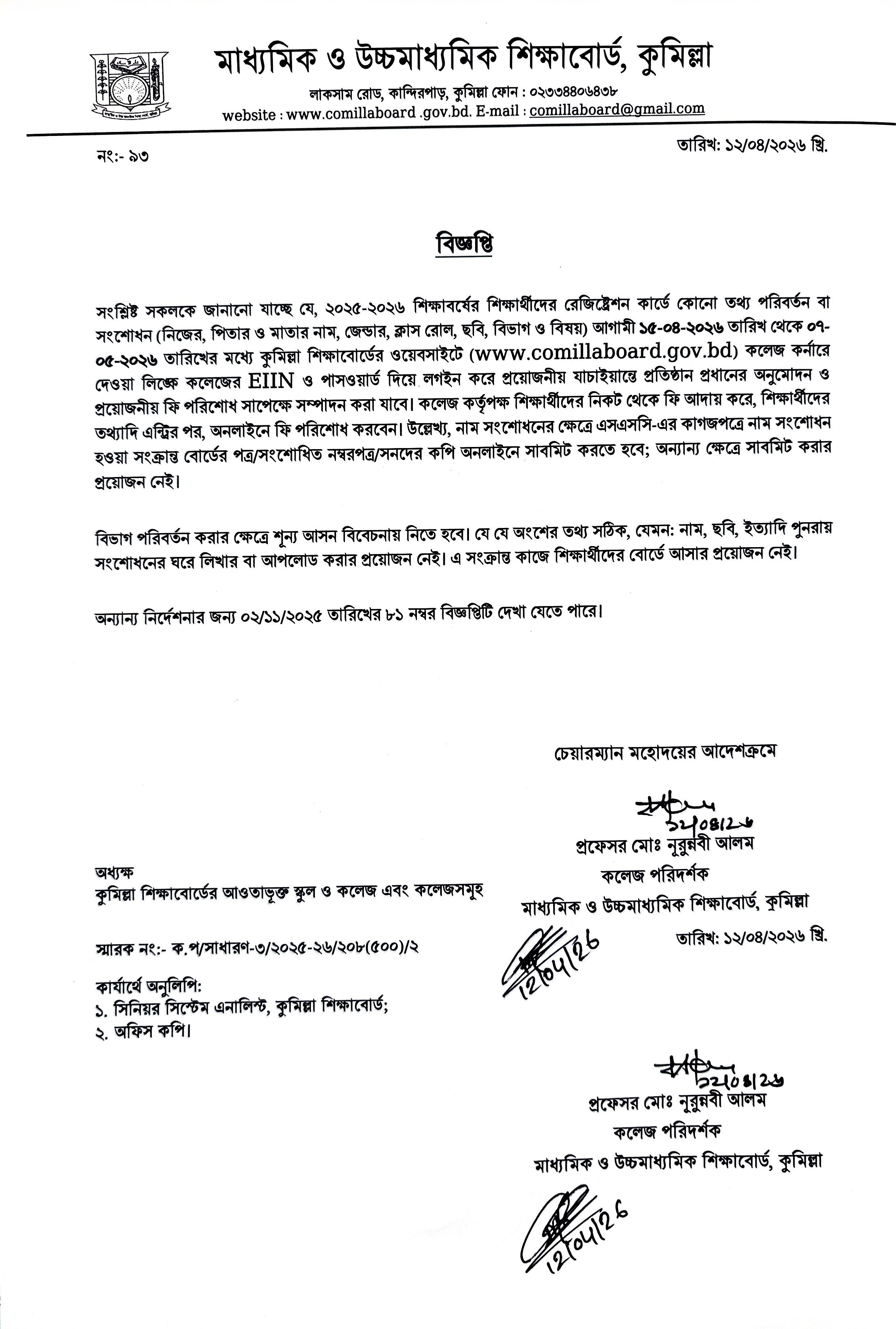 ২০২৫-২৬ শিক্ষাবর্ষের একাদশ শ্রেণির শিক্ষার্থীদের রেজি. কার্ডে ভুল সংশোধন বা পরিবর্তন প্রসঙ্গে